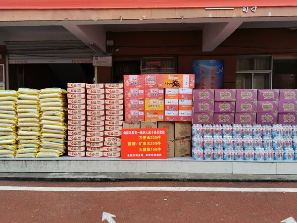 當天上午,阜陽(yáng)華聯(lián)集團為他們送去了200件礦泉水、200件方便面、100件火腿腸。