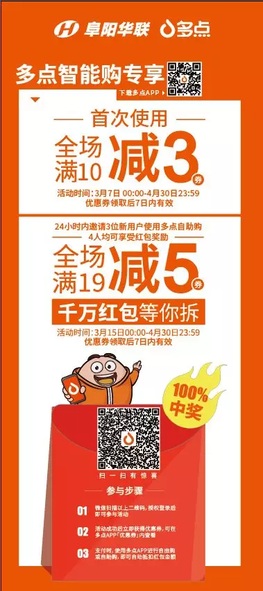 活動(dòng)細則:1、多點(diǎn)用戶(hù)在阜陽(yáng)華聯(lián)門(mén)店,微信掃描海報上的小程序碼,領(lǐng)取價(jià)值12元微信支付多點(diǎn)優(yōu)惠券1張;數量有限,領(lǐng)完為止。